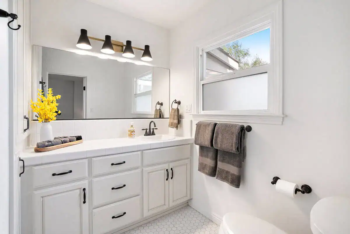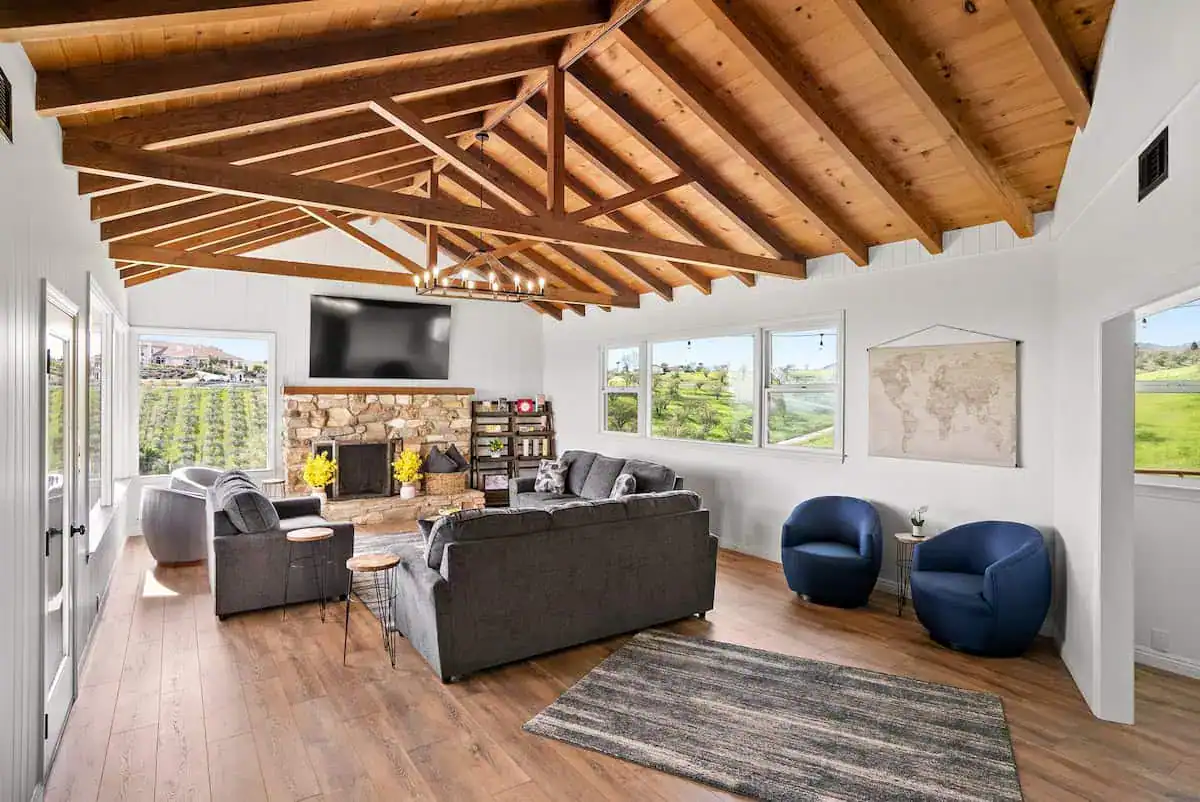 Vina Vista’s four-bedroom farmhouse vacation rental in Paso Robles accommodates up to eight guests in the main house, with an optional casita available for larger groups of up to ten. The heart of this Paso Robles vacation home is its expansive great room, where exposed ceiling beams frame floor-to-ceiling windows that showcase uninterrupted views of the surrounding wine country landscape. The open-concept design flows effortlessly from the fully equipped gourmet kitchen through the airy dining area to multiple outdoor living spaces, creating the ideal environment for gathering with friends and family. High-speed Starlink internet service and an impressive 85-inch smart TV in the great room, plus two additional 65-inch smart TVs throughout the property, ensure modern connectivity while maintaining the serene wine country atmosphere.