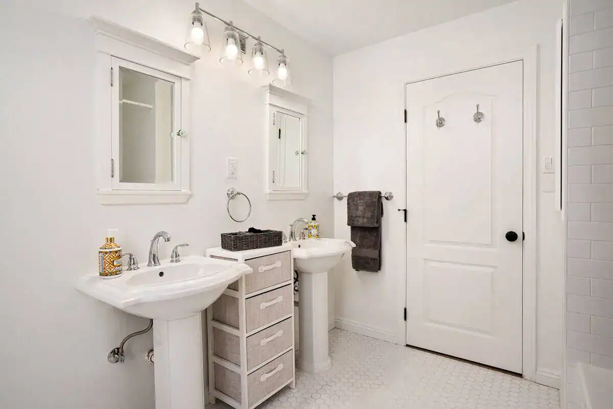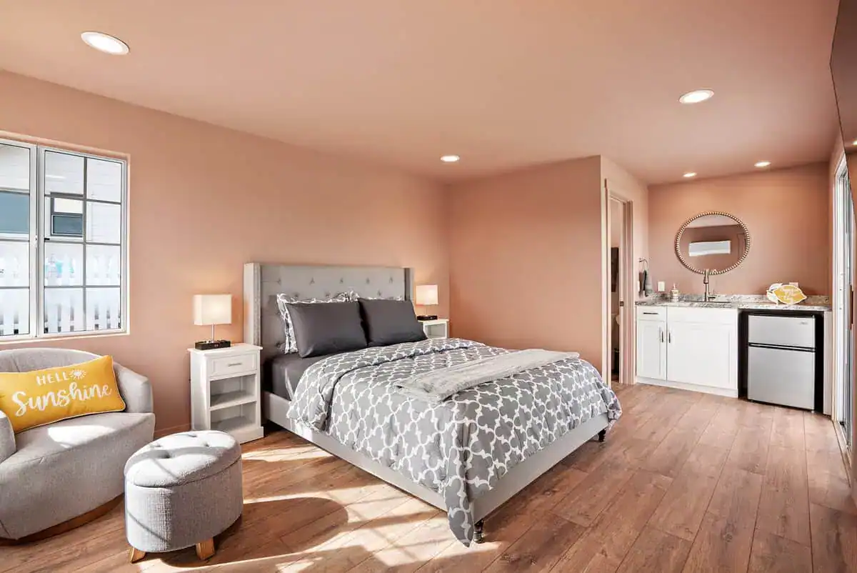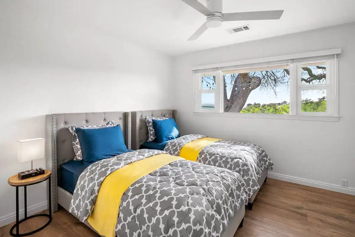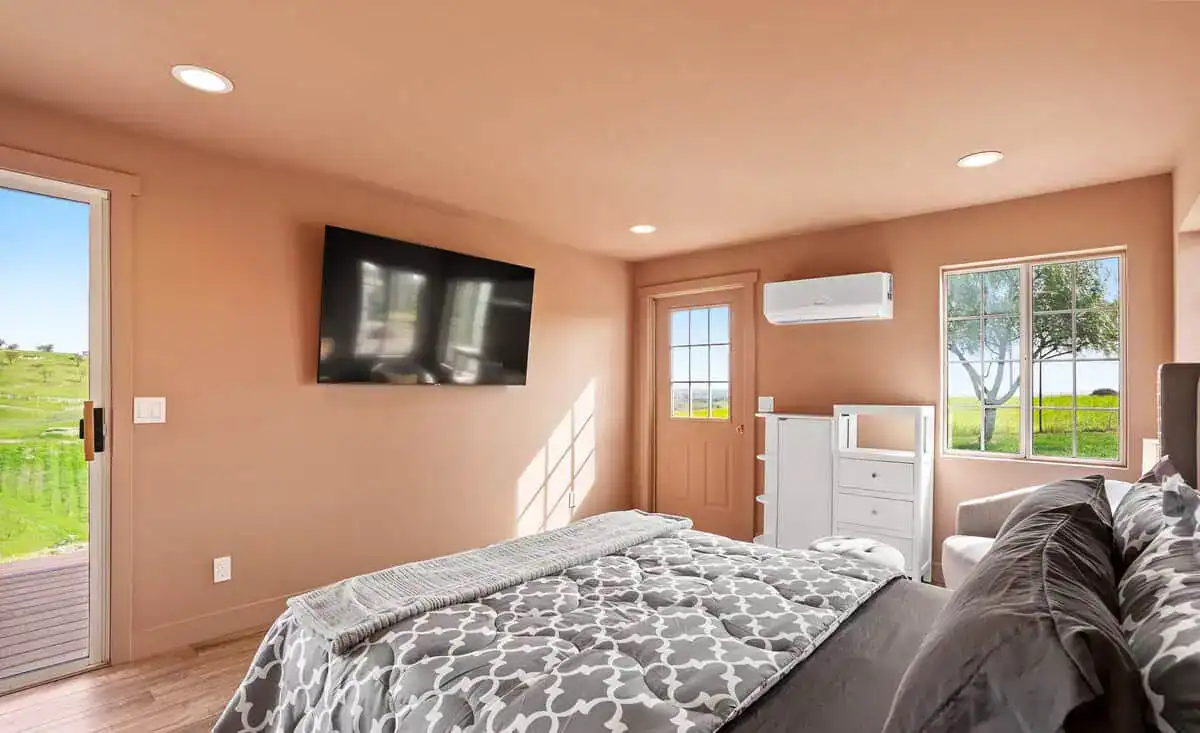 Inside, Vina Vista’s thoughtful design caters to both relaxation and entertainment. Two bedrooms feature firm-support queen beds, while two additional bedrooms offer twin bed configurations ideal for children or flexible group arrangements. The primary bedroom suite includes a 65-inch smart TV, walk-in closet, and private bathroom with walk-in shower. The separate casita serves as a private retreat with its own soft-support queen bed, 65-inch smart TV, full bathroom, and small refrigerator—perfect for multi-generational families or groups seeking additional privacy. Central heating and cooling throughout ensure comfort during Paso Robles’ warm summer days and cooler winter evenings.